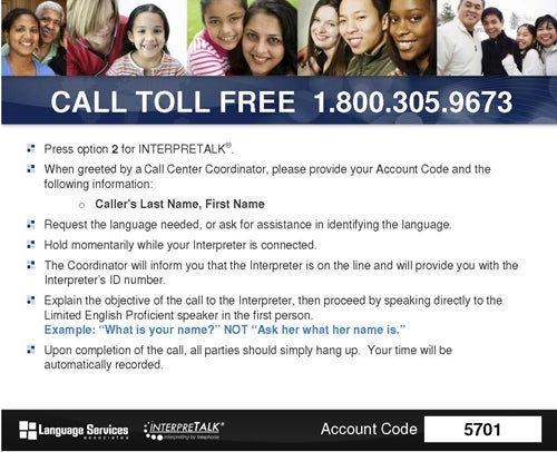 For interpreter services you can call the toll free number and follow the step by step instructions: